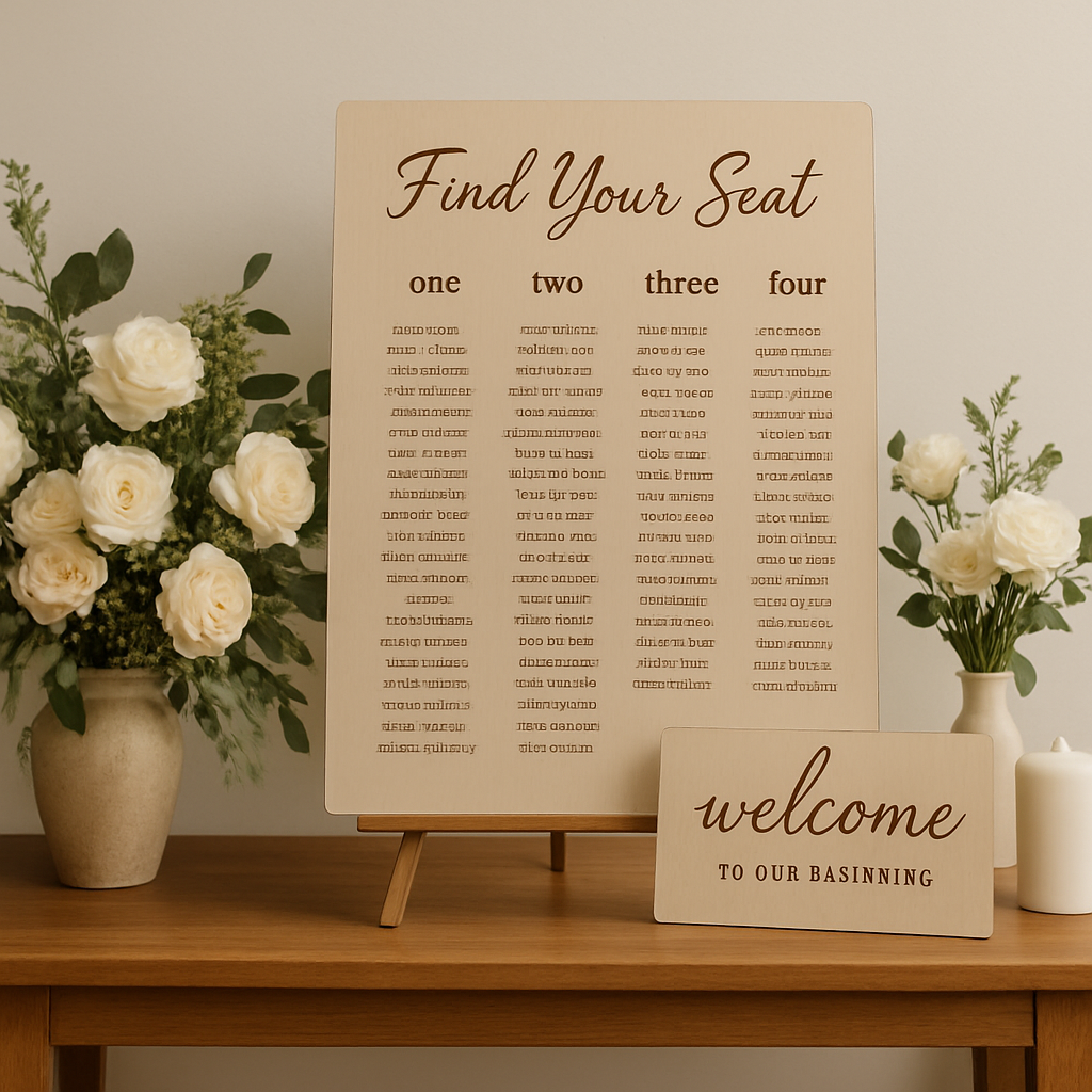 Make your big day unforgettable with personalized wedding displays. From custom seating charts and elegant welcome signs to wedding party itineraries and décor, each piece is crafted with precision and style. Designed to match your theme and made to last, these custom engravings help bring your love story to life while guiding your guests with ease.